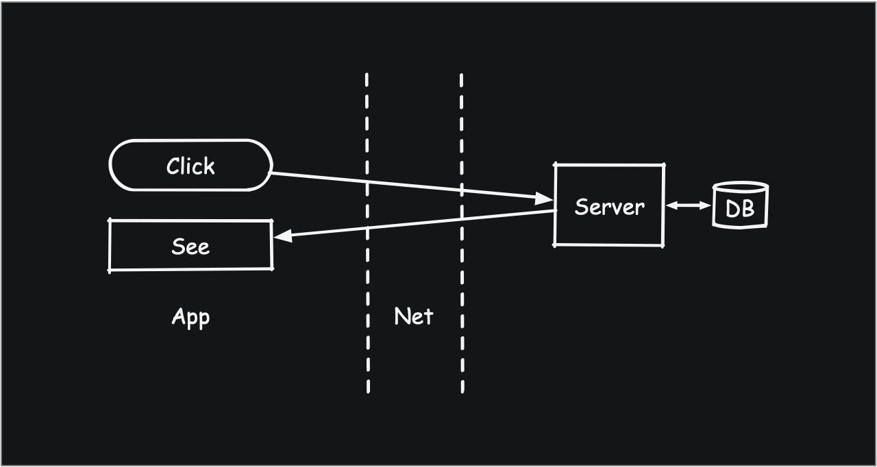With a cloud-first architecture, the client typically makes a request to the server, the server processes the request, often interacting with a database, and then sends back a response. Two key aspects of this to highlight: